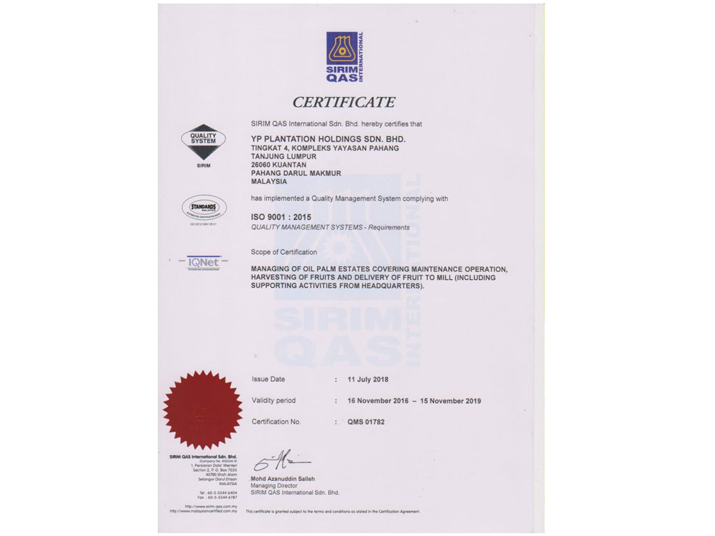 YP Plantation Holdings sdn bhd adalah syarikat pertama di pahang dan ke-3 dalam malaysia yang menerima pensijilan Anti-bribery Management System (ABMS) dari SIRIM QAS International dalam skop perladangan.