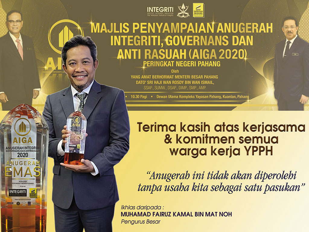 YPPH telah berjaya menerima Anugerah Emas AIGA yang berlangsung pada 26 Oktober 2021 bertempat di Dewan Utama Yayasan Pahang.