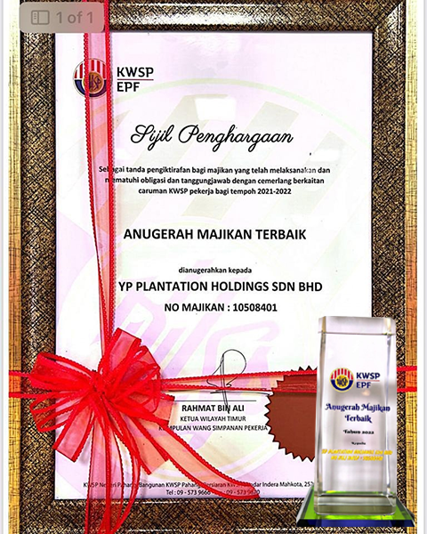 YP Plantation Holdings Sdn. Bhd. telah memenangi Anugerah KWSP - Majikan Terbaik 2022 bagi kategori Majikan Berskala Besar Peringkat Wilayah Timur pada 2 November 2022.